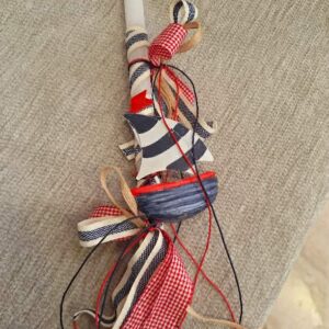 Λαμπάδα λευκή για αγόρια,45εκ.διακοσμημένη με καραβάκι από ξύλο και μέταλλο. Ασσορτί υπέροχης ποιότητας κορδέλες και κορδόνια δίνουν ένα τέλειο ναυτικό