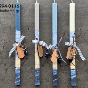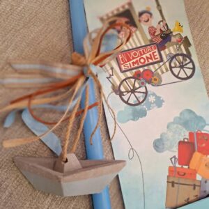 Λαμπάδα γαλάζια 40εκ.για αγόρι,διακοσμημένη με τσιμεντένιο καραβάκι, και με κορδέλες/κορδόνια βαμβακερές,στις διάφορες αποχρώσεις του γαλάζιου,γιούτα, μέσα σε πολυτελή τσάντα