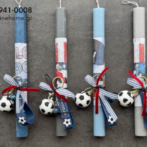 Λαμπάδα στρογγυλή παραφίνης,για αγόρι,30-35εκ.περίπου, σε 4 χρωματισμούς,ντεκουπάζ,διακοσμημένη με μπρελόκ μπάλα και ασσορτί κορδέλες και κορδόνια μέσα σε πολυτελή τσάντα