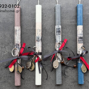 Λαμπάδα στρογγυλή παραφίνης,για αγόρι,35εκ.περίπου, σε 4 χρωματισμούς,ντεκουπάζ,διακοσμημένη με μπρελόκ μεταλλική ρακέτα και ασσορτί κορδέλες και κορδόνια μέσα σε πολυτελή τσάντα