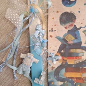Λαμπάδα παιδική αγορίστικη,πλακέ,40 εκ.,γαλάζια και λευκή,διακοσμημένη με γαλάζια ρουχαλάκια και παιχνίδια πολυρεζίν,καθώς και με ασσορτί χρώματα κορδόνια και κορδέλες υπέροχης