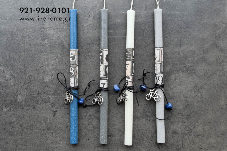 Λαμπάδα για αγόρι σε 4χρωμ.περίπου 30εκ,με ντεκουπάζ,διακοσμημένη με μεταλλικό ποδήλατο,μέσα σε πολυτελή τσάντα.