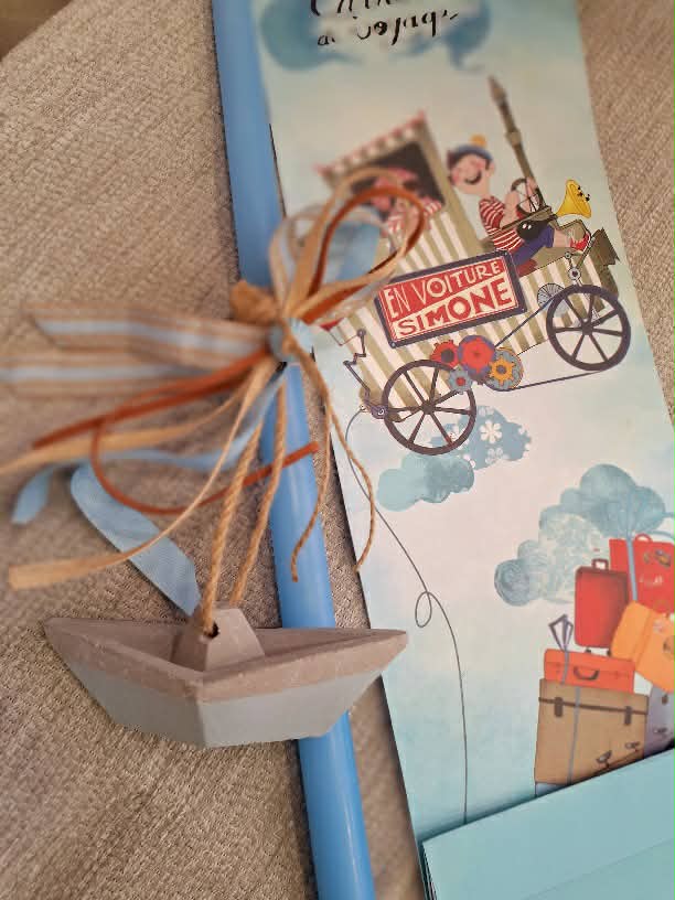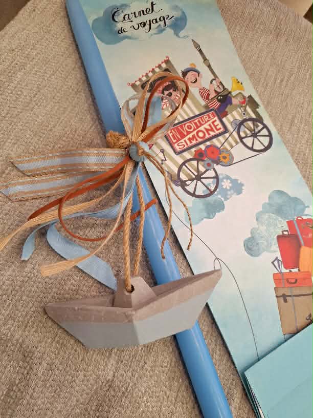 Λαμπάδα γαλάζια 40εκ.για αγόρι,διακοσμημένη με τσιμεντένιο καραβάκι,